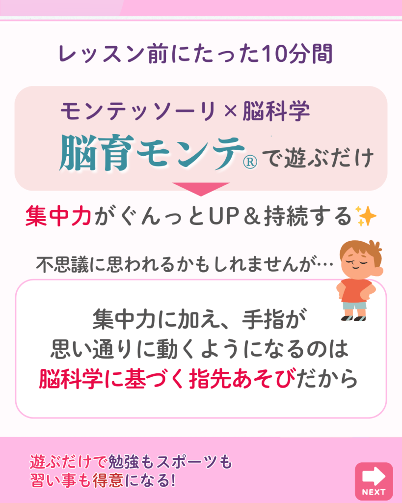 脳育モンテは、知育より手前の段階の脳を育てていくメソッドで、